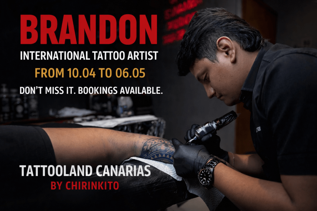 We’re proud to host Brandon at Tattooland Canarias by Chirinkito for a limited time. From 10.04.26 to 06.05,.26 you’ll have the opportunity to get tattooed by an international artist known for clean, precise work and distinctive designs.