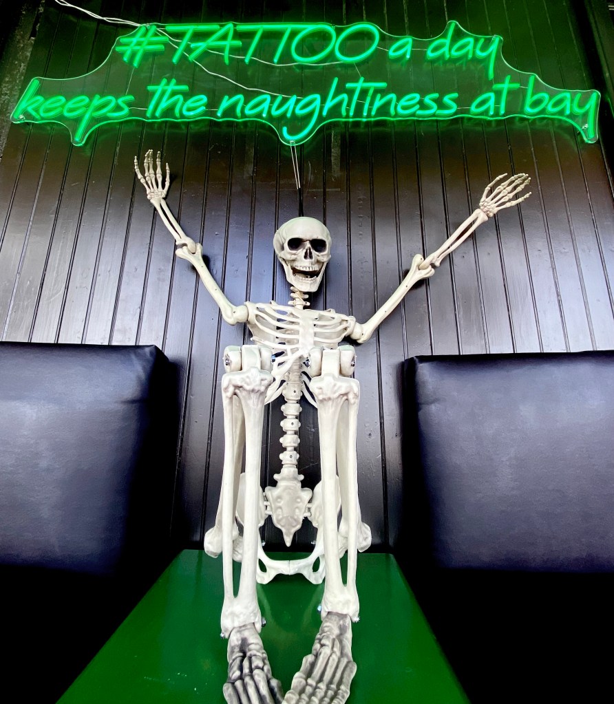 Bum Bum is our beloved skeletal superstar who welcomes every visitor with a toothy grin and an unshakeable charm. Whether you’re stopping by for a quick browse or getting a tattoo, Bum Bum sets the mood with his timeless style and friendly (though slightly rattly) personality. Bum Bum is rumoured to be over 300 years old, but still looks great for his age. He is photogenic from every angle, got unwavering customer service and legendary stillness. Bum Bum loves company. Feel free to snap a selfie with him anytime—he’ll stand still, promise!